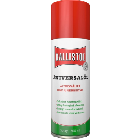 Ballistol Universale spray, pulisce e rimuove residui di polvere, piombo, depositi di rame e tombacco. Non indurisce, si insinua nelle fessure più fini, protegge da ruggine, lubrifica e pulisce, scioglie lo sporco vecchio e resine di oli non idonei, neutralizza i residui della combustione. Anche per la pulizia, la cura e la conservazione di cuoio e calci in legno. Biodegradabile, rispettoso dell'ambiente, privo di PTFE e silicone.